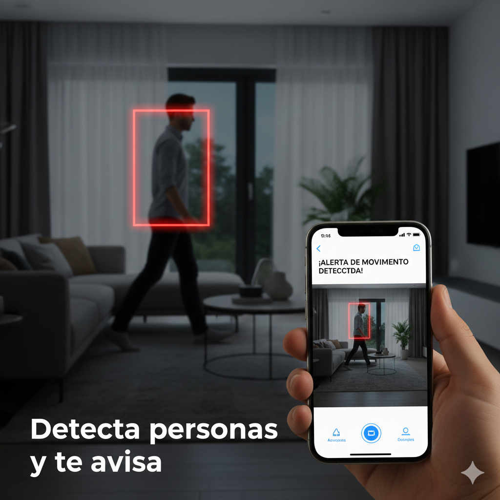 Sí. Detecta personas, sigue el movimiento y envía notificaciones automáticas al celular.